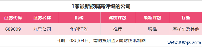 评级调高方面,8月4日,券商调高上市公司评级达到1家次,配资门户APP下载最新数据包括了华创证券对九号公司的评级从“推荐”调高至“强推”。