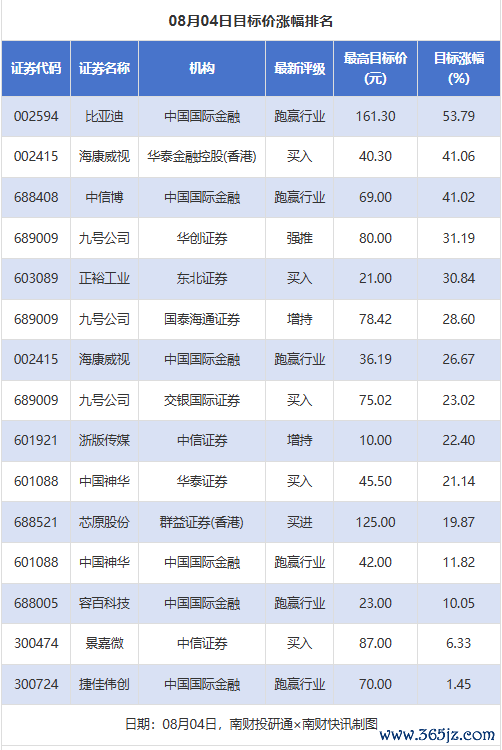 南财投研通数据显示前海配资安全不,8月4日,券商给予上市公司目标价共15次,按最新收盘价计算,目标价涨幅排名居前的公司有比亚迪、海康威视、中信博,目标价涨幅分别为53.79%、41.06%、41.02%,分别属于乘用车、计算机设备、光伏设备行业。