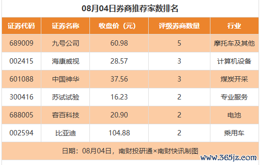 从券商推荐家数来看,8月4日有32家上市公司得到券商推荐,其中九号公司获得5家推荐,海康威视获得3家推荐,中国神华获得3家推荐。