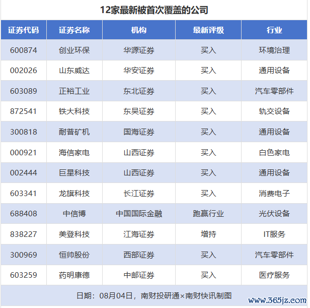 首次覆盖方面,8月4日券商共给出了12次首次覆盖,其中创业环保获得华源证券给予“买入”评级,山东威达获得华安证券给予“买入”评级前海配资安全不,正裕工业获得东北证券给予“买入”评级,铁大科技获得东吴证券给予“买入”评级,耐普矿机获得国海证券给予“买入”评级。